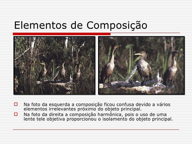 15. 15. Elementos de Composição <ul><li>Na foto da esquerda a composição ficou confusa devido a vários elementos irrelevantes próximo do objeto principal. </li></ul><ul><li>Na foto da direita a composição harmônica, pois o uso de uma lente tele objetiva proporcionou o isolamento do objeto principal. </li></ul>