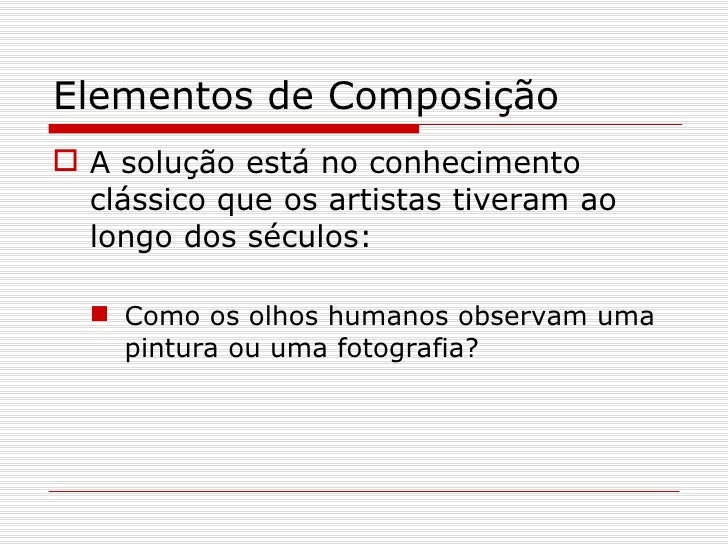 3. 3. Elementos de Composição <ul><li>A solução está no conhecimento clássico que os artistas tiveram ao longo dos séculos: </li></ul><ul><ul><li>Como os olhos humanos observam uma pintura ou uma fotografia? </li></ul></ul>