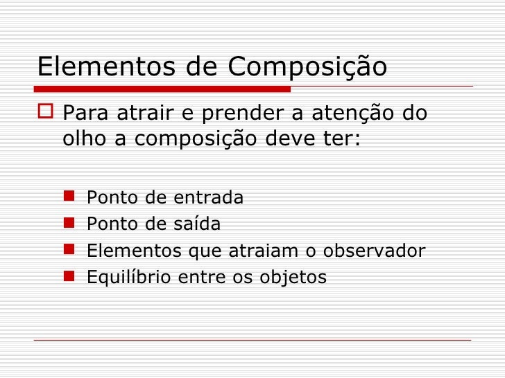 4. 4. Elementos de Composição <ul><li>Para atrair e prender a atenção do olho a composição deve ter: </li></ul><ul><ul><li>Ponto de entrada </li></ul></ul><ul><ul><li>Ponto de saída </li></ul></ul><ul><ul><li>Elementos que atraiam o observador </li></ul></ul><ul><ul><li>Equilíbrio entre os objetos </li></ul></ul>