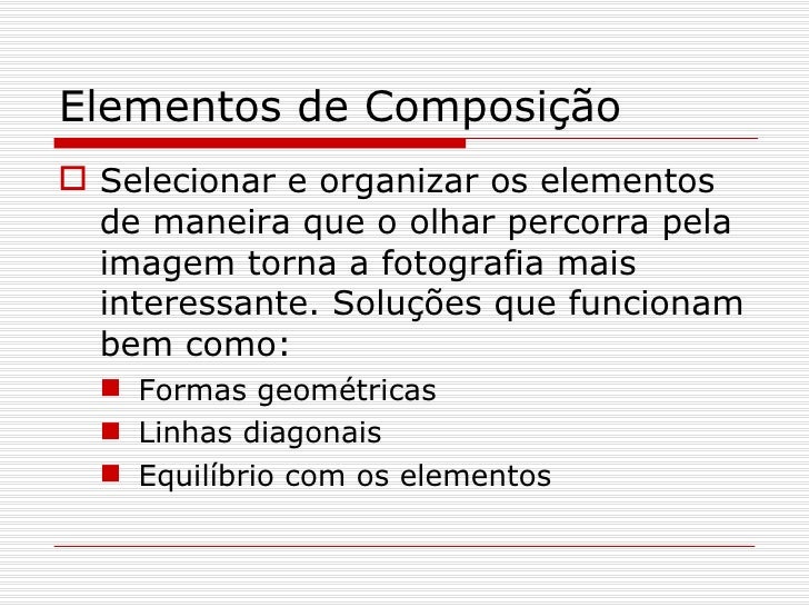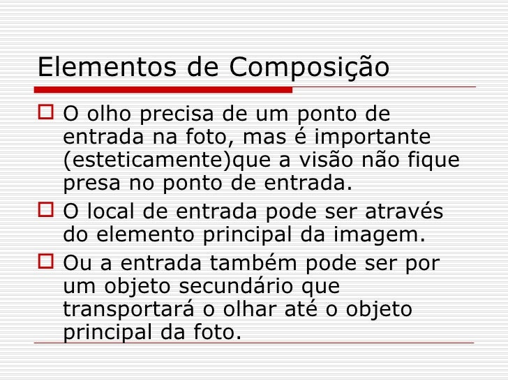2. 2. Elementos de Composição <ul><li>Muitas pessoas tem “o olho” que possibilita a realização de fotografias naturalmente. Por outro lado muitos não possuem esta habilidade e precisam encontrar soluções que ajudem a superar esta limitação e proporcione a provar sua capacidade visual. </li></ul>