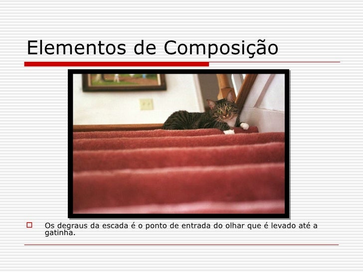 7. 7. Elementos de Composição <ul><li>Os degraus da escada é o ponto de entrada do olhar que é levado até a gatinha. </li></ul>