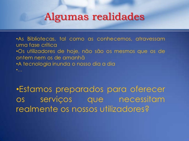 12. 12. Algumas realidades•As Bibliotecas, tal como as conhecemos, atravessamuma fase crítica•Os utilizadores de hoje, não são os mesmos que os deontem nem os de amanhã•A tecnologia inunda o nosso dia a dia•…•Estamos preparados para ofereceros serviços que necessitamrealmente os nossos utilizadores?