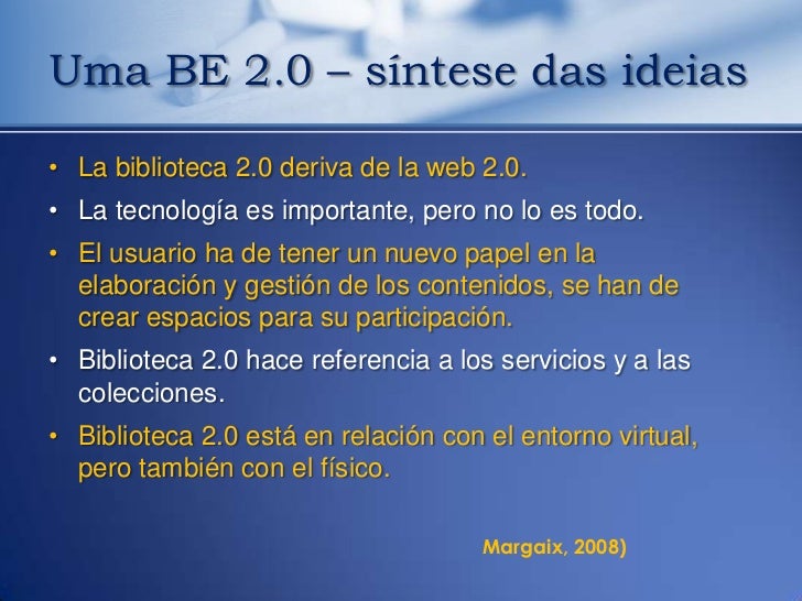 14. 14. Uma BE 2.0 – síntese das ideias• La biblioteca 2.0 deriva de la web 2.0.• La tecnología es importante, pero no lo es todo.• El usuario ha de tener un nuevo papel en la elaboración y gestión de los contenidos, se han de crear espacios para su participación.• Biblioteca 2.0 hace referencia a los servicios y a las colecciones.• Biblioteca 2.0 está en relación con el entorno virtual, pero también con el físico. Margaix, 2008)