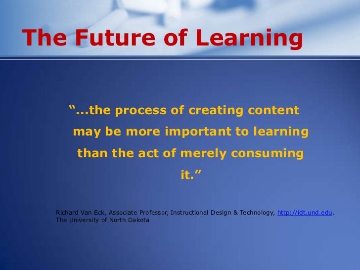 18. 18. The Future of Learning “...the process of creating content may be more important to learning than the act of merely consuming it.” Richard Van Eck, Associate Professor, Instructional Design & Technology, http://idt.und.edu. The University of North Dakota