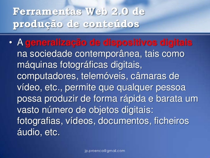 20. 20. Ferramentas Web 2.0 deprodução de conteúdos• A generalização de dispositivos digitais na sociedade contemporânea, tais como máquinas fotográficas digitais, computadores, telemóveis, câmaras de vídeo, etc., permite que qualquer pessoa possa produzir de forma rápida e barata um vasto número de objetos digitais: fotografias, vídeos, documentos, ficheiros áudio, etc. jp.proenca@gmail.com