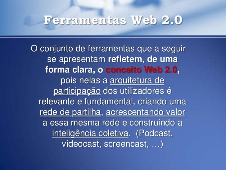 21. 21. Ferramentas Web 2.0O conjunto de ferramentas que a seguir se apresentam refletem, de uma forma clara, o conceito Web 2.0, pois nelas a arquitetura de participação dos utilizadores é relevante e fundamental, criando uma rede de partilha, acrescentando valor a essa mesma rede e construindo a inteligência coletiva. (Podcast, videocast, screencast, …)