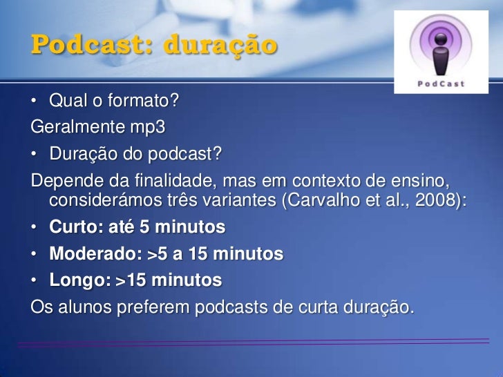 24. 24. Podcast: duração• Qual o formato?Geralmente mp3• Duração do podcast?Depende da finalidade, mas em contexto de ensino, considerámos três variantes (Carvalho et al., 2008):• Curto: até 5 minutos• Moderado: >5 a 15 minutos• Longo: >15 minutosOs alunos preferem podcasts de curta duração.