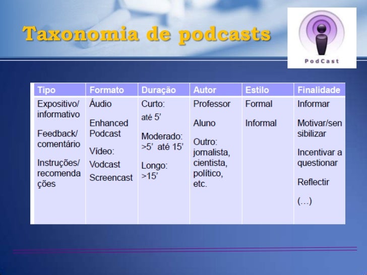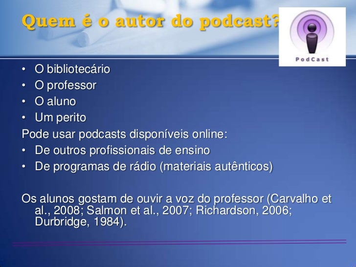 25. 25. Quem é o autor do podcast?• O bibliotecário• O professor• O aluno• Um peritoPode usar podcasts disponíveis online:• De outros profissionais de ensino• De programas de rádio (materiais autênticos)Os alunos gostam de ouvir a voz do professor (Carvalho et al., 2008; Salmon et al., 2007; Richardson, 2006; Durbridge, 1984).