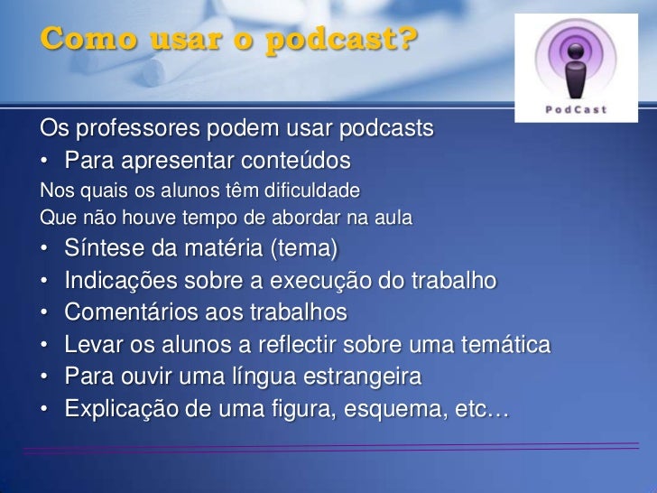 27. 27. Como usar o podcast?Os professores podem usar podcasts• Para apresentar conteúdosNos quais os alunos têm dificuldadeQue não houve tempo de abordar na aula• Síntese da matéria (tema)• Indicações sobre a execução do trabalho• Comentários aos trabalhos• Levar os alunos a reflectir sobre uma temática• Para ouvir uma língua estrangeira• Explicação de uma figura, esquema, etc…