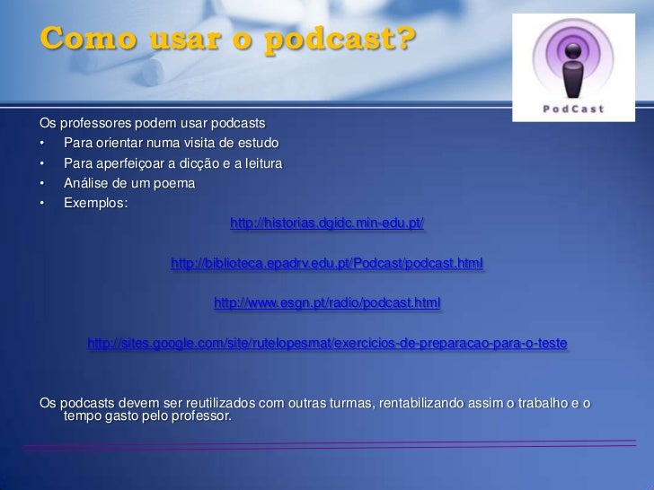 28. 28. Como usar o podcast?Os professores podem usar podcasts• Para orientar numa visita de estudo• Para aperfeiçoar a dicção e a leitura• Análise de um poema• Exemplos: http://historias.dgidc.min-edu.pt/ http://biblioteca.epadrv.edu.pt/Podcast/podcast.html http://www.esgn.pt/radio/podcast.html http://sites.google.com/site/rutelopesmat/exercicios-de-preparacao-para-o-testeOs podcasts devem ser reutilizados com outras turmas, rentabilizando assim o trabalho e o tempo gasto pelo professor.