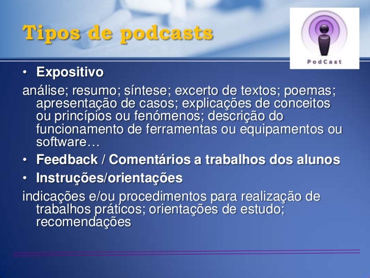 30. 30. Tipos de podcasts• Expositivoanálise; resumo; síntese; excerto de textos; poemas; apresentação de casos; explicações de conceitos ou princípios ou fenómenos; descrição do funcionamento de ferramentas ou equipamentos ou software…• Feedback / Comentários a trabalhos dos alunos• Instruções/orientaçõesindicações e/ou procedimentos para realização de trabalhos práticos; orientações de estudo; recomendações