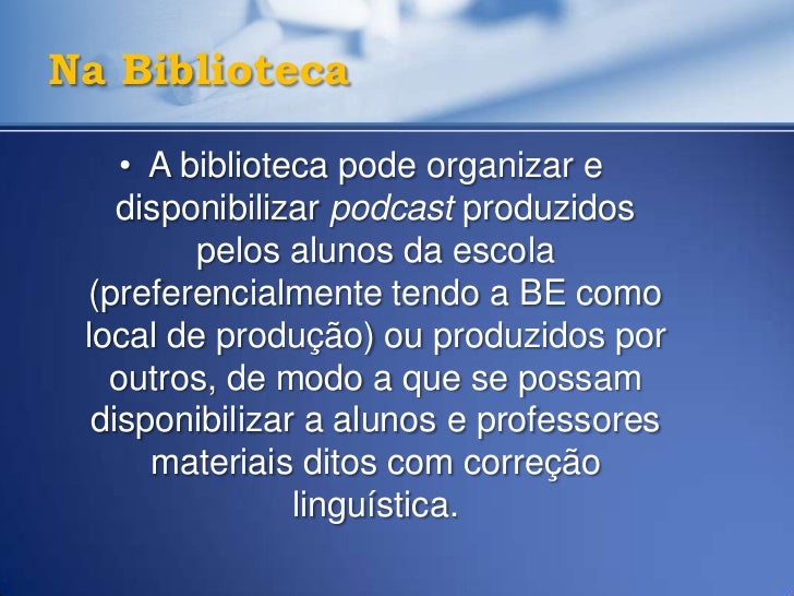 32. 32. Na Biblioteca • A biblioteca pode organizar e disponibilizar podcast produzidos pelos alunos da escola (preferencialmente tendo a BE como local de produção) ou produzidos por outros, de modo a que se possam disponibilizar a alunos e professores materiais ditos com correção linguística.