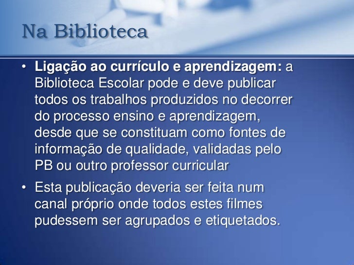 36. 36. Na Biblioteca• Ligação ao currículo e aprendizagem: a Biblioteca Escolar pode e deve publicar todos os trabalhos produzidos no decorrer do processo ensino e aprendizagem, desde que se constituam como fontes de informação de qualidade, validadas pelo PB ou outro professor curricular• Esta publicação deveria ser feita num canal próprio onde todos estes filmes pudessem ser agrupados e etiquetados.