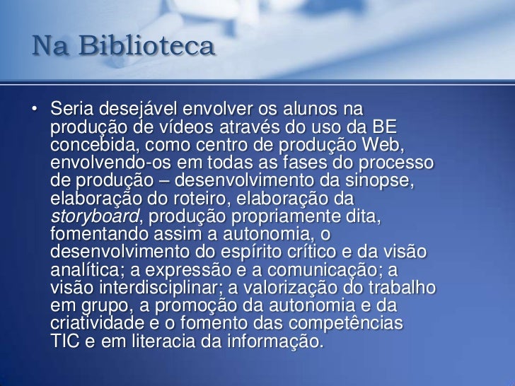 37. 37. Na Biblioteca• Seria desejável envolver os alunos na produção de vídeos através do uso da BE concebida, como centro de produção Web, envolvendo-os em todas as fases do processo de produção – desenvolvimento da sinopse, elaboração do roteiro, elaboração da storyboard, produção propriamente dita, fomentando assim a autonomia, o desenvolvimento do espírito crítico e da visão analítica; a expressão e a comunicação; a visão interdisciplinar; a valorização do trabalho em grupo, a promoção da autonomia e da criatividade e o fomento das competências TIC e em literacia da informação.