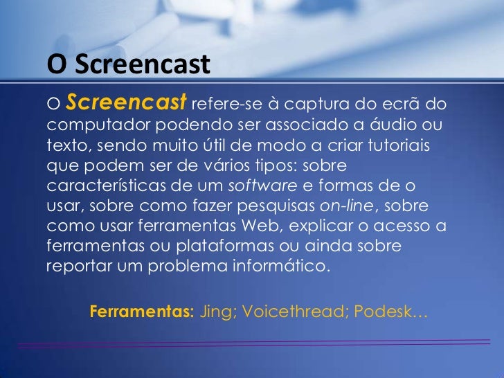40. 40. O ScreencastO Screencast refere-se à captura do ecrã docomputador podendo ser associado a áudio outexto, sendo muito útil de modo a criar tutoriaisque podem ser de vários tipos: sobrecaracterísticas de um software e formas de ousar, sobre como fazer pesquisas on-line, sobrecomo usar ferramentas Web, explicar o acesso aferramentas ou plataformas ou ainda sobrereportar um problema informático. Ferramentas: Jing; Voicethread; Podesk…