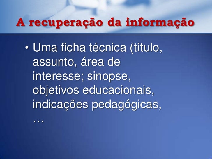 41. 41. A recuperação da informação • Uma ficha técnica (título, assunto, área de interesse; sinopse, objetivos educacionais, indicações pedagógicas, …