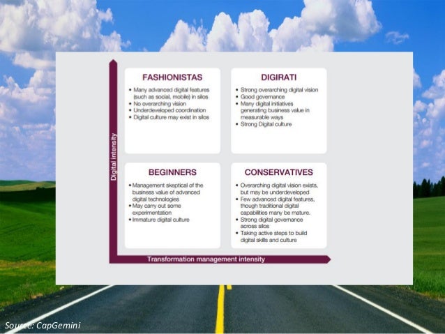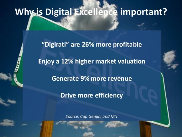 Digitally mature companies out-perform their peers in innovation, agility and responsiveness to customers. “Digirati” also enjoy advantages in efficiency and effectiveness in product delivery, marketing, e-commerce, sales and customer service. More importantly, companies that achieve Digital Excellence are 26% more profitable (source: Capgemini Consulting and MIT Centre for Digital Business).