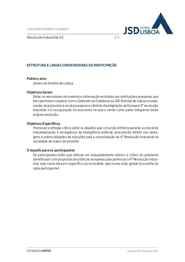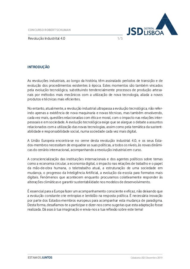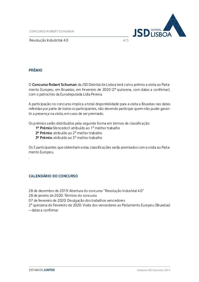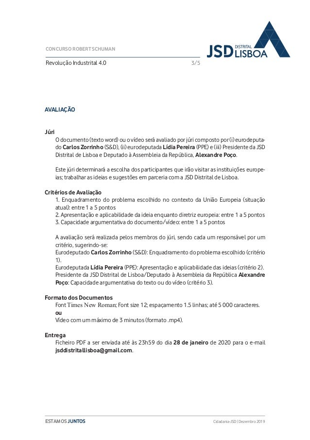 Depois do sucesso das edições anteriores, a JSD Distrital de Lisboa lança hoje o 3º Concurso Robert Schuman, com um desafio aos jovens sobre a “Revolução Industrial 4.0”. O Concurso terá como prémio a visita ao Parlamento Europeu, em Bruxelas, em Fevereiro, a convite da Eurodeputada Lídia Pereira.