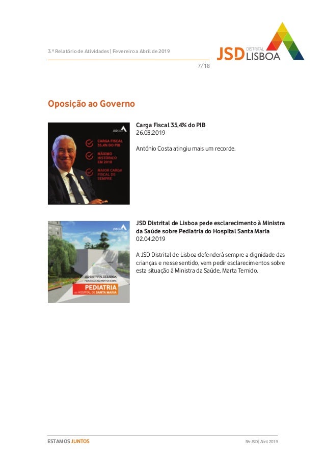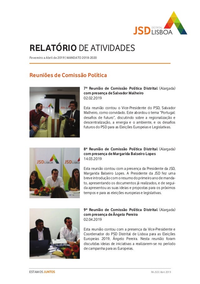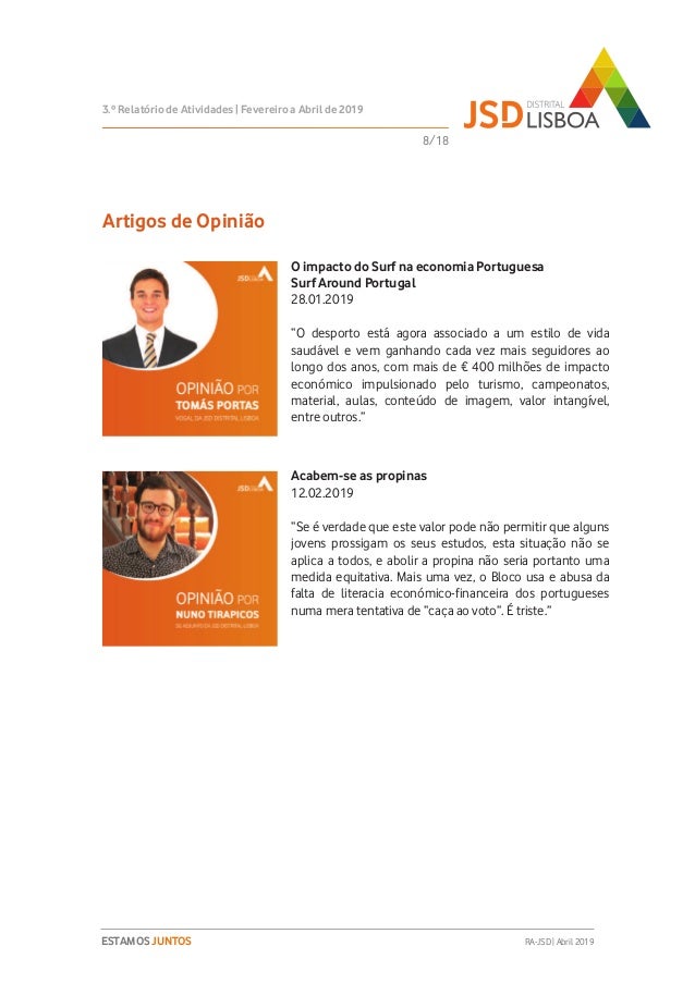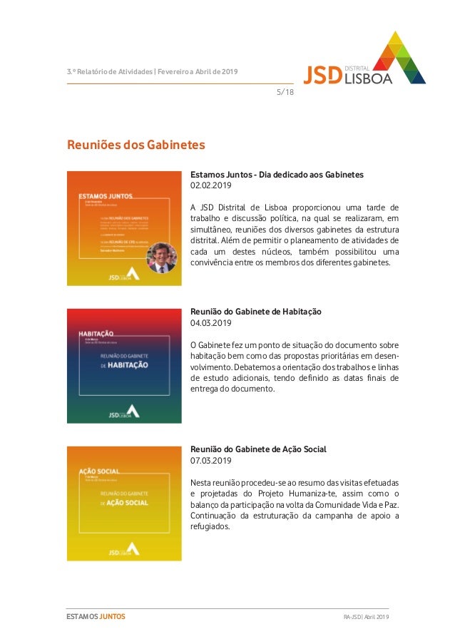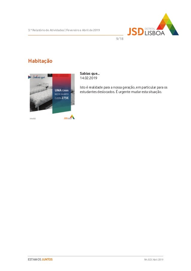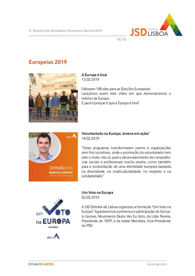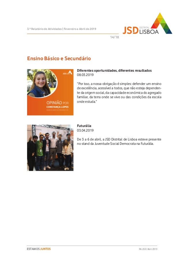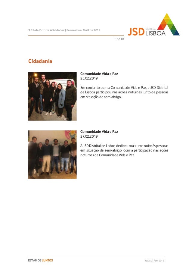 Relatório de Atividades do 3º Trimestre (Fevereiro a Abril de 2019) do Mandato 2018-2020 da JSD Distrital de Lisboa.