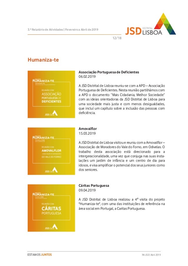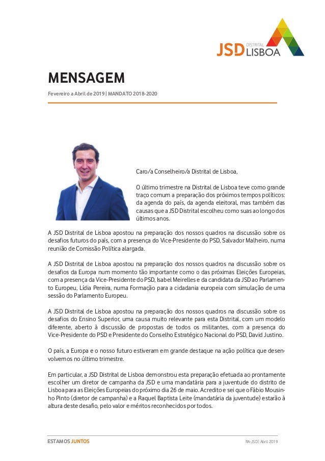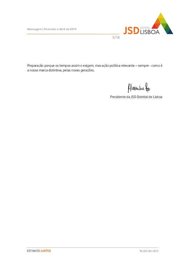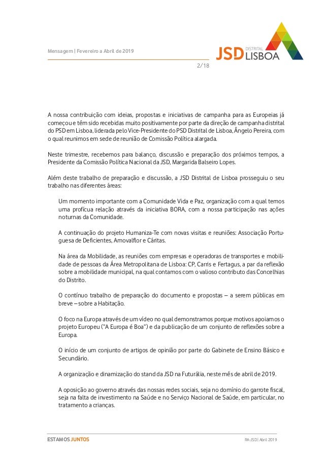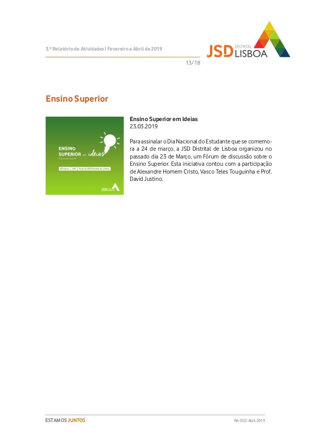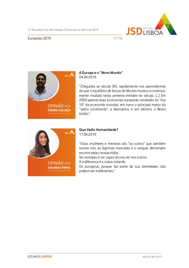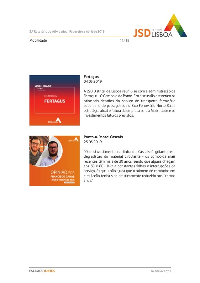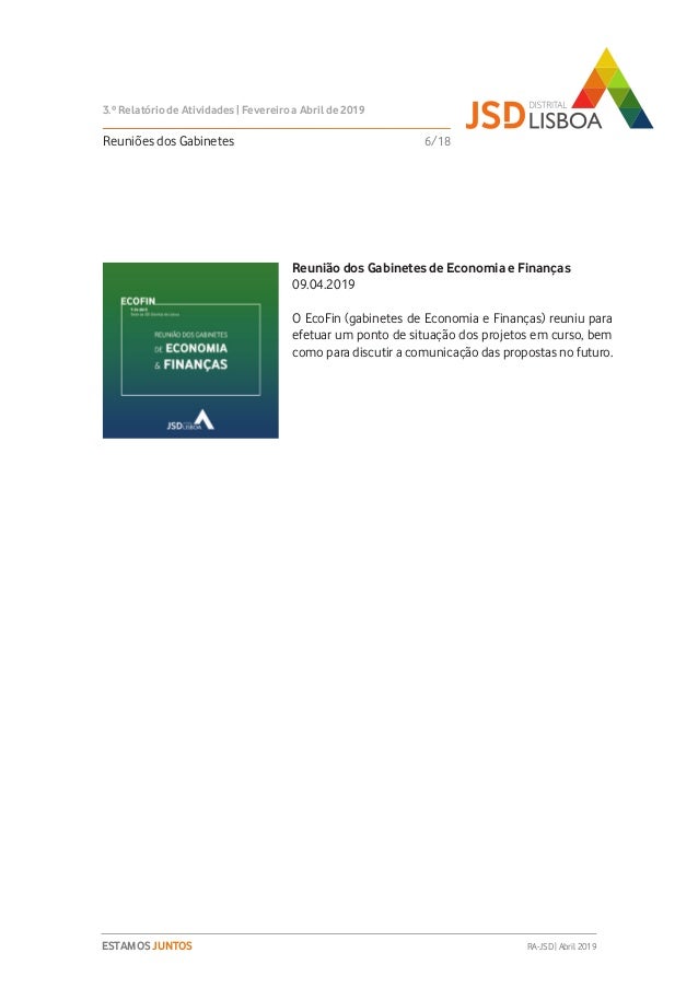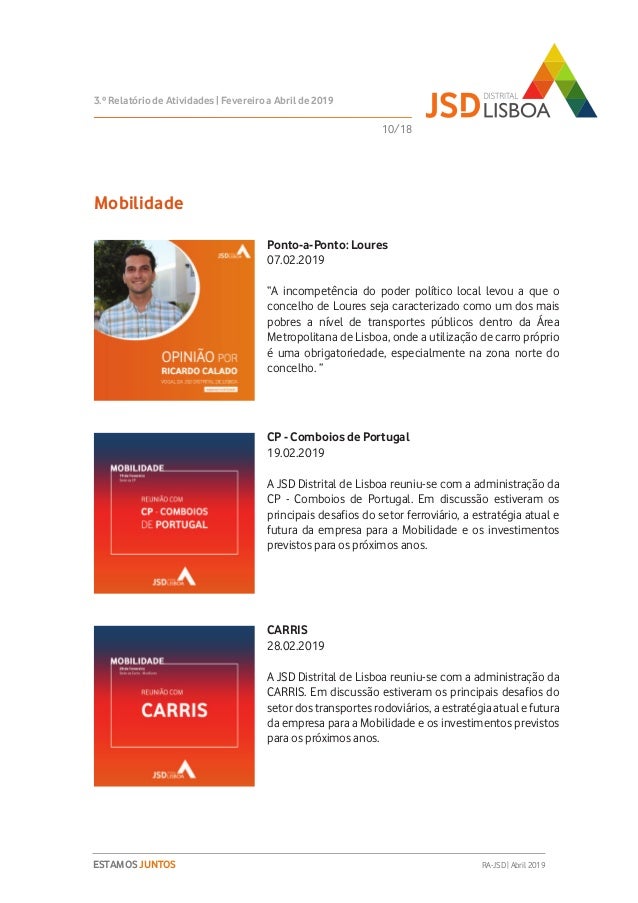 Relatório de Atividades do 3º Trimestre (Fevereiro a Abril de 2019) do Mandato 2018-2020 da JSD Distrital de Lisboa.