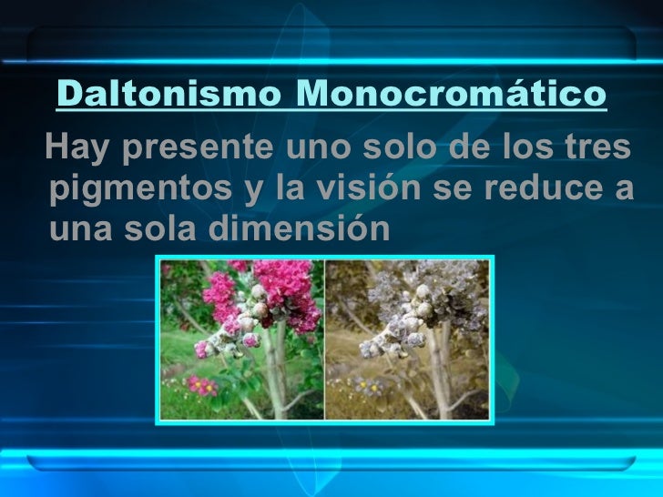 9. 10. Daltonismo Monocromático <ul><li>Hay presente uno solo de los tres pigmentos y la visión se reduce a una sola dimensión </li></ul>