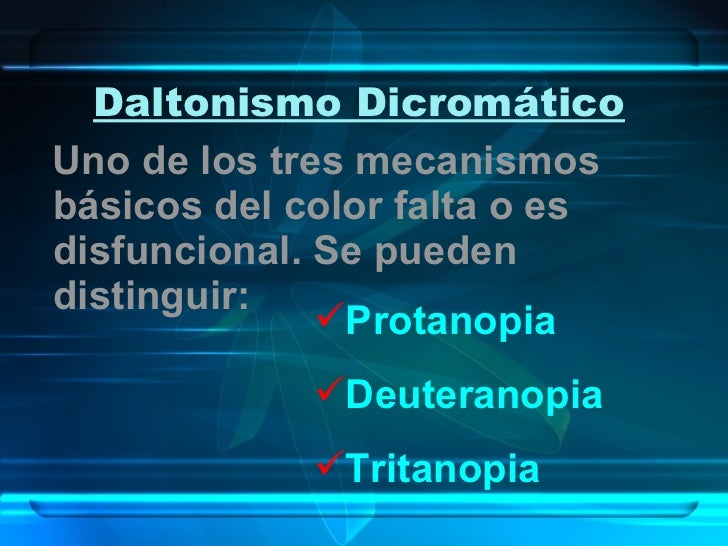 10. 11. Daltonismo Dicromático <ul><li>Uno de los tres mecanismos básicos del color falta o es disfuncional. Se pueden distinguir: </li></ul><ul><li>Protanopia </li></ul><ul><li>Deuteranopia </li></ul><ul><li>Tritanopia </li></ul>