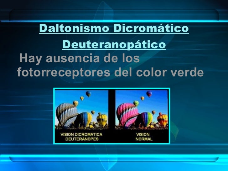 12. 13. Daltonismo Dicromático Deuteranopático <ul><li>Hay ausencia de los fotorreceptores del color verde </li></ul>
