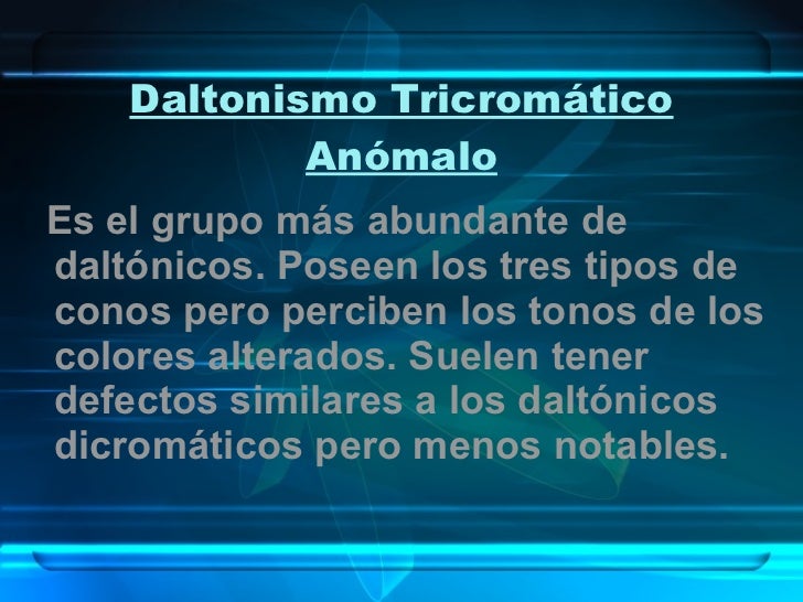 14. 15. Daltonismo Tricromático Anómalo <ul><li>Es el grupo más abundante de daltónicos. Poseen los tres tipos de conos pero perciben los tonos de los colores alterados. Suelen tener defectos similares a los daltónicos dicromáticos pero menos notables. </li></ul>