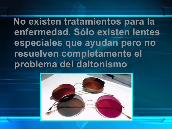 18. 19. <ul><li>No existen tratamientos para la enfermedad. Sólo existen lentes especiales que ayudan pero no resuelven completamente el problema del daltonismo </li></ul>