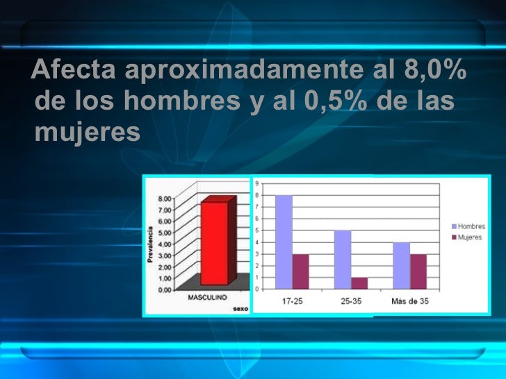 5. 6. <ul><li>Afecta aproximadamente al 8,0% de los hombres y al 0,5% de las mujeres </li></ul>