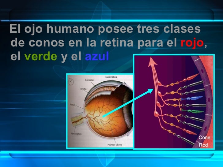 6. 7. <ul><li>El ojo humano posee tres clases de conos en la retina para el rojo , el verde y el azul </li></ul>