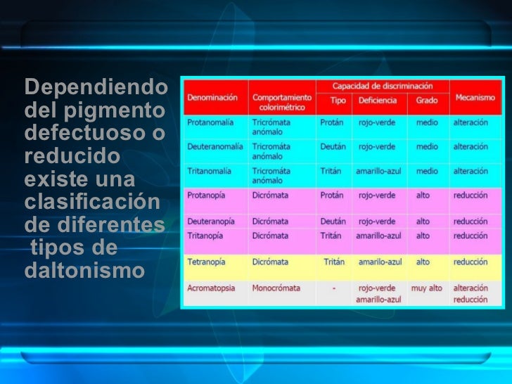 7. 8. <ul><li>Dependiendo del pigmento defectuoso o reducido existe una clasificación de diferentes tipos de daltonismo </li></ul>