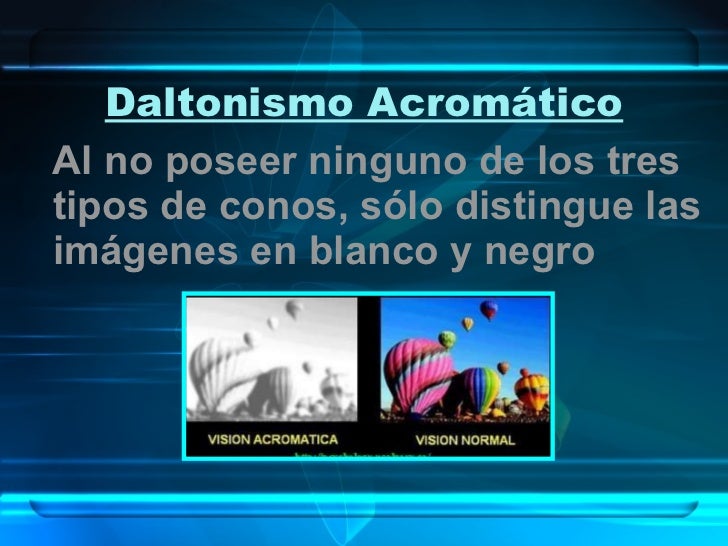 8. 9. Daltonismo Acromático <ul><li>Al no poseer ninguno de los tres tipos de conos, sólo distingue las imágenes en blanco y negro </li></ul>