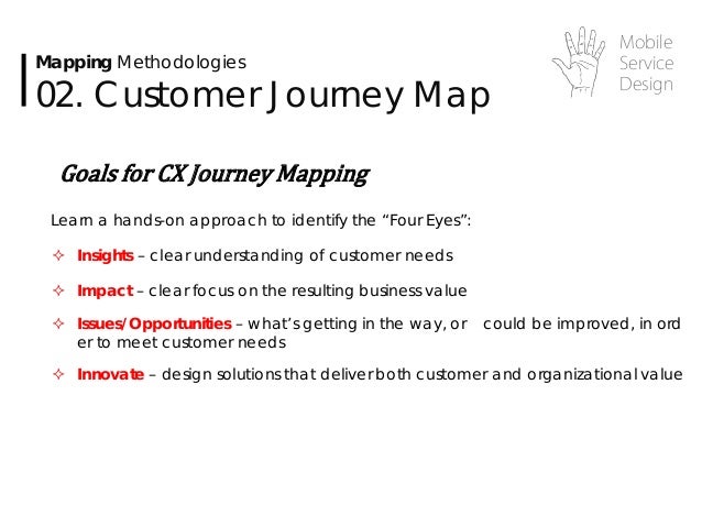10. 10. Mobile Service Design Learn a hands-on approach to identify the “Four Eyes”:  Insights – clear understanding of customer needs  Impact – clear focus on the resulting business value  Issues/Opportunities – what’s getting in the way, or could be improved, in ord er to meet customer needs  Innovate – design solutions that deliver both customer and organizational value Goals for CX Journey Mapping Mapping Methodologies 02. Customer Journey Map