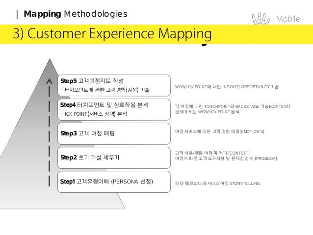14. 14. Mobile Service Designcustomer lifecycle3) Customer Experience Mapping | Mapping Methodologies Step5 고객여정지도 작성 - 터치포인트에 관한 고객 경험(감성) 기술 Step4 터치포인트 및 상호작용 분석 - WOW POINT(가능성) / ICK POINT(서비스 장벽) 분석 Step3 고객 여정 매핑 Step2 초기 가설 세우기 Step1 고객유형이해 (PERSONA 선정)