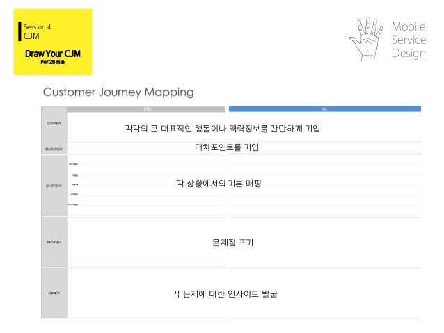 18. 18. Mobile Service Design Session 4 CJM Draw Your CJM For 25 min 각각의 큰 대표적인 행동이나 맥락정보를 간단하게 기입 터치포인트를 기입 각 상황에서의 기분 매핑 문제점 표기 각 문제에 대한 인사이트 발굴