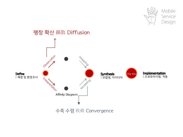 3. 3. Mobile Service Design Define | 배경 및 환경조사 Discovery | 사용자 조사 및 관찰 Synthesis | 모델링, 아이디어 Implementation | 프로토타이핑, 적용 !Big Idea 팽창 확산 擴散 Diffusion Affinity Diagram 수축 수렴 收斂 Convergence