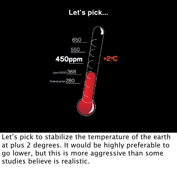 10. 10. Letʼs pick... Let’s pick to stabilize the temperature of the earth at plus 2 degrees. It would be highly preferable to go lower, but this is more aggressive than some studies believe is realistic.