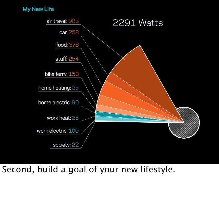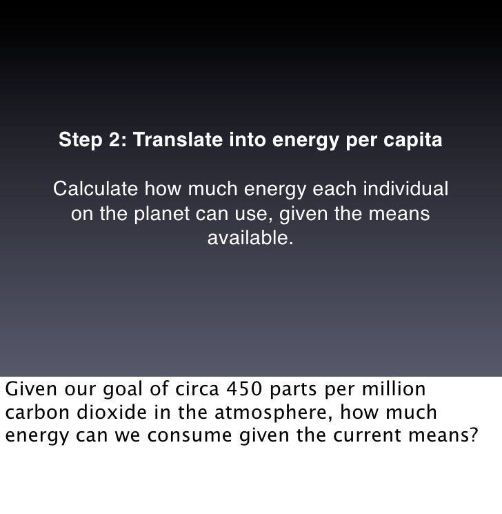 11. 11. Step 2: Translate into energy per capita Calculate how much energy each individual on the planet can use, given the means available. Given our goal of circa 450 parts per million carbon dioxide in the atmosphere, how much energy can we consume given the current means?