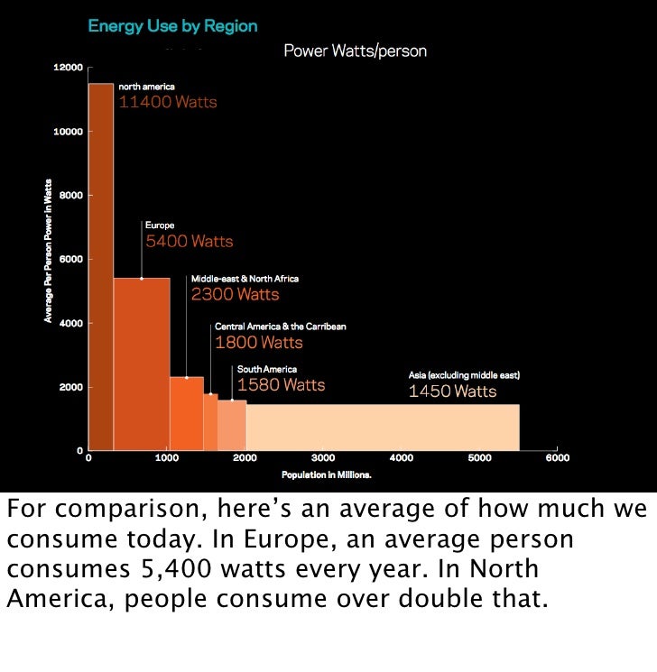 13. 13. For comparison, here’s an average of how much we consume today. In Europe, an average person consumes 5,400 watts every year. In North America, people consume over double that.