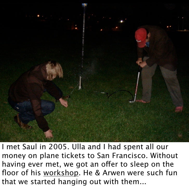 2. 2. I met Saul in 2005. Ulla and I had spent all our money on plane tickets to San Francisco. Without having ever met, we got an offer to sleep on the floor of his workshop. He & Arwen were such fun that we started hanging out with them...