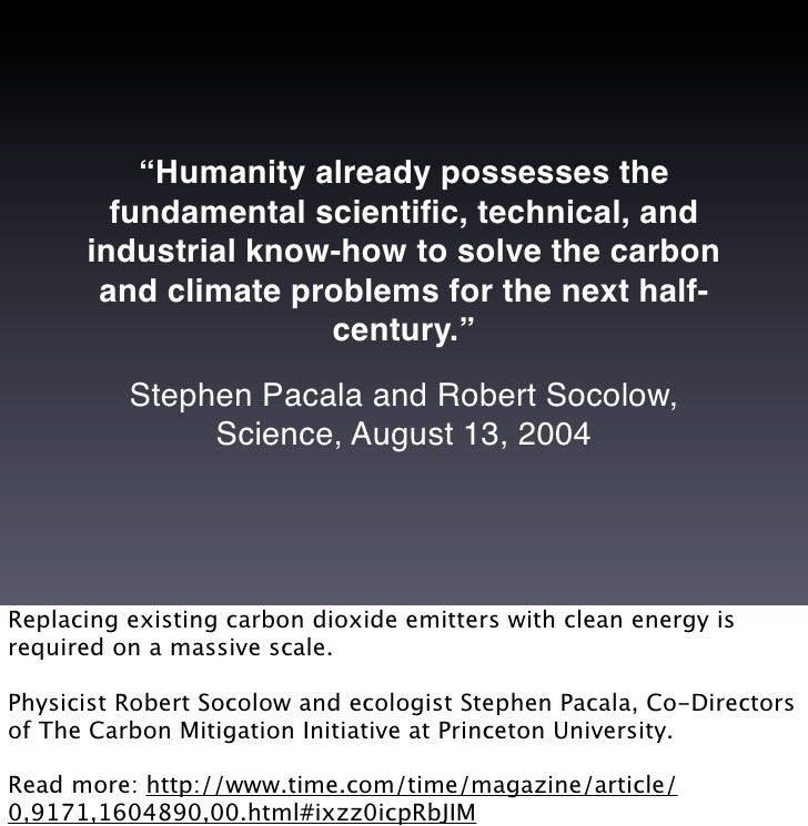 20. 20. “Humanity already possesses the fundamental scientific, technical, and industrial know-how to solve the carbon and climate problems for the next half- century.” Stephen Pacala and Robert Socolow, Science, August 13, 2004 Replacing existing carbon dioxide emitters with clean energy is required on a massive scale. Physicist Robert Socolow and ecologist Stephen Pacala, Co-Directors of The Carbon Mitigation Initiative at Princeton University. Read more: http://www.time.com/time/magazine/article/ 0,9171,1604890,00.html#ixzz0icpRbJIM