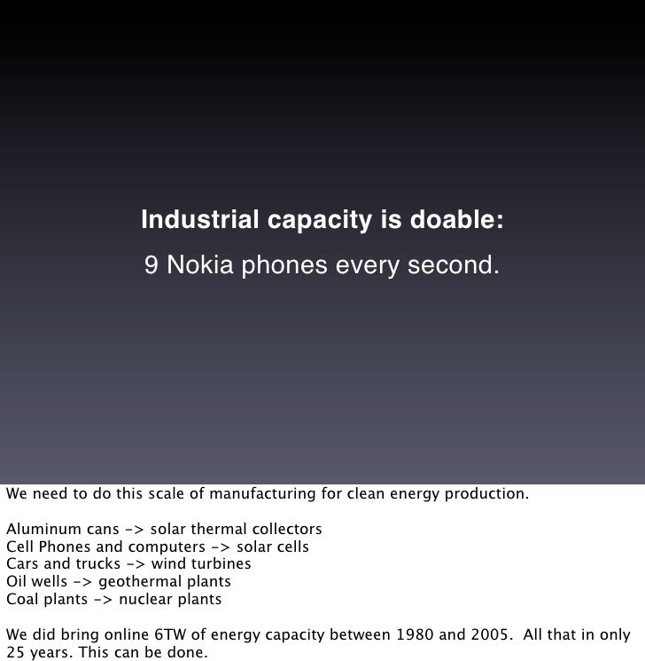 21. 21. Industrial capacity is doable: 9 Nokia phones every second. We need to do this scale of manufacturing for clean energy production. Aluminum cans -> solar thermal collectors Cell Phones and computers -> solar cells Cars and trucks -> wind turbines Oil wells -> geothermal plants Coal plants -> nuclear plants We did bring online 6TW of energy capacity between 1980 and 2005. All that in only 25 years. This can be done.