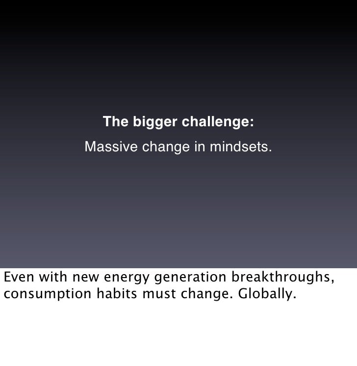 22. 22. The bigger challenge: Massive change in mindsets. Even with new energy generation breakthroughs, consumption habits must change. Globally.