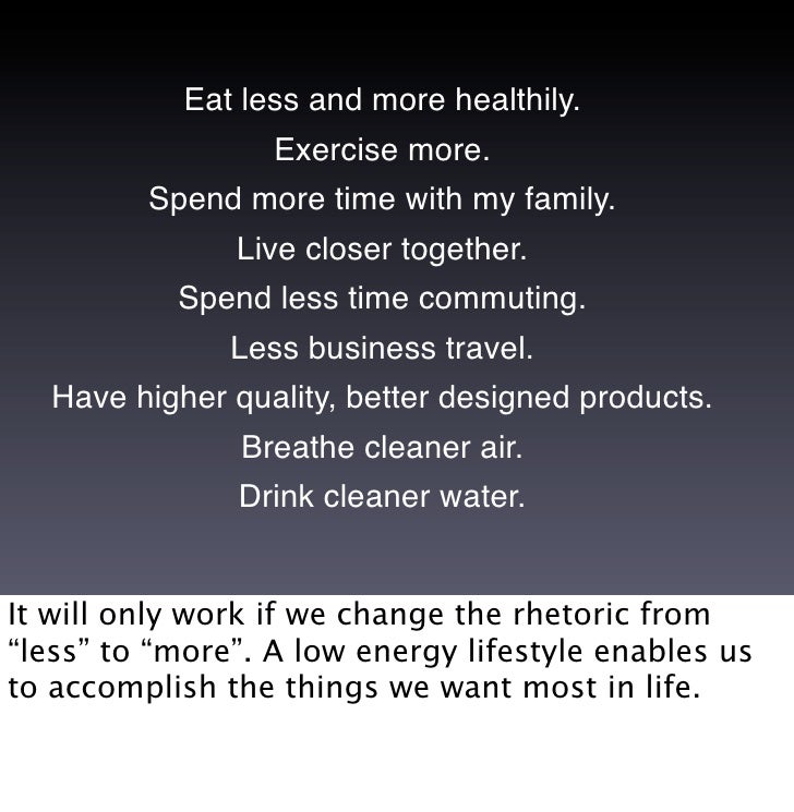 24. 24. Eat less and more healthily. Exercise more. Spend more time with my family. Live closer together. Spend less time commuting. Less business travel. Have higher quality, better designed products. Breathe cleaner air. Drink cleaner water. It will only work if we change the rhetoric from “less” to “more”. A low energy lifestyle enables us to accomplish the things we want most in life.