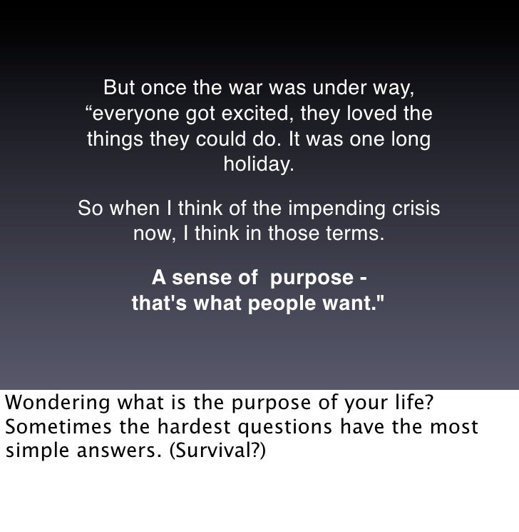 27. 27. But once the war was under way, “everyone got excited, they loved the things they could do. It was one long holiday. So when I think of the impending crisis now, I think in those terms. A sense of purpose - that's what people want." Wondering what is the purpose of your life? Sometimes the hardest questions have the most simple answers. (Survival?)