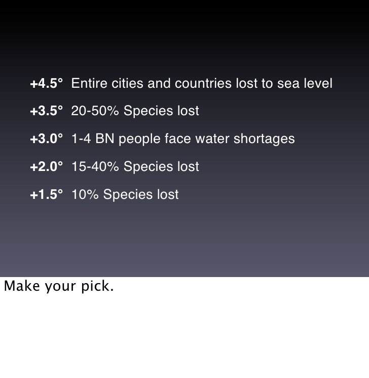7. 7. +4.5° Entire cities and countries lost to sea level +3.5° 20-50% Species lost +3.0° 1-4 BN people face water shortages +2.0° 15-40% Species lost +1.5° 10% Species lost Make your pick.
