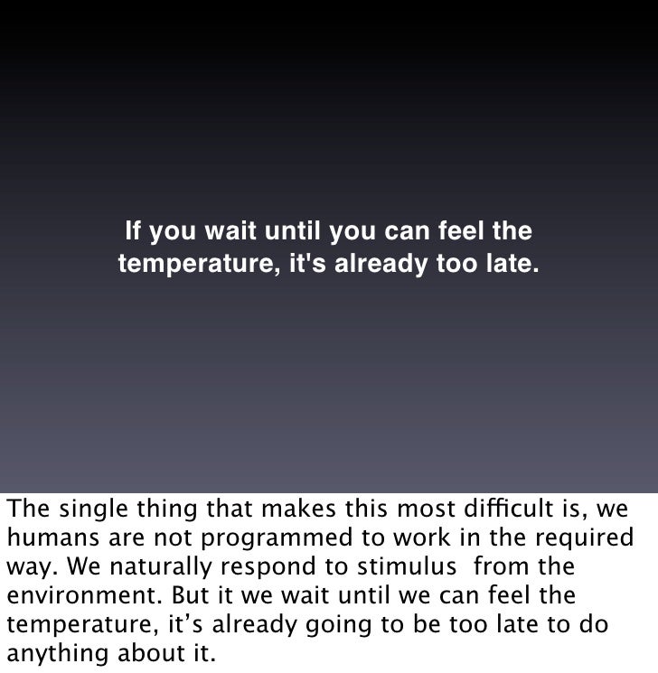 8. 8. If you wait until you can feel the temperature, it's already too late. The single thing that makes this most difficult is, we humans are not programmed to work in the required way. We naturally respond to stimulus from the environment. But it we wait until we can feel the temperature, it’s already going to be too late to do anything about it.