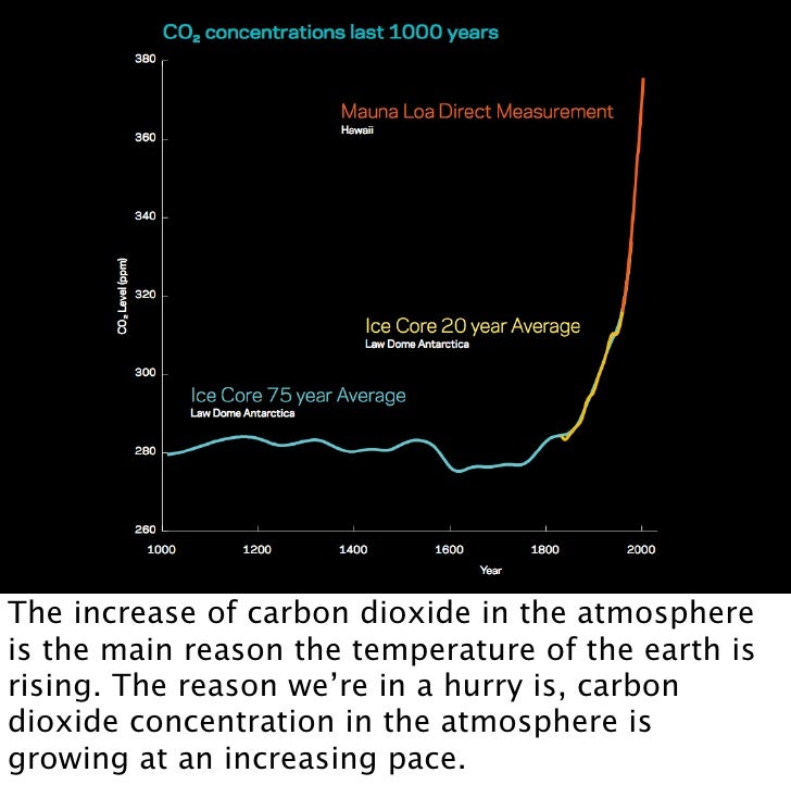 9. 9. The increase of carbon dioxide in the atmosphere is the main reason the temperature of the earth is rising. The reason we’re in a hurry is, carbon dioxide concentration in the atmosphere is growing at an increasing pace.