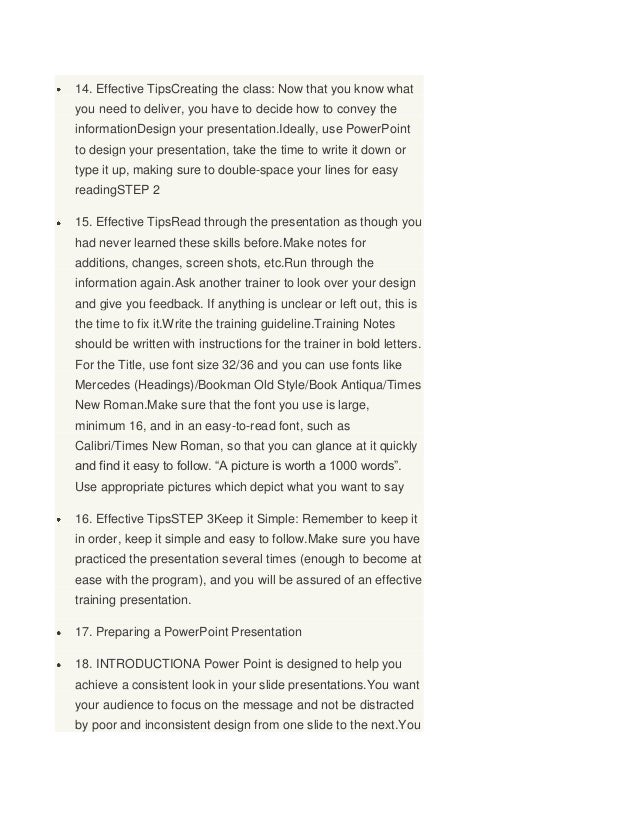 4. 4. 14. Effective TipsCreating the class: Now that you know whatyou need to deliver, you have to decide how to convey theinformationDesign your presentation.Ideally, use PowerPointto design your presentation, take the time to write it down ortype it up, making sure to double-space your lines for easyreadingSTEP 215. Effective TipsRead through the presentation as though youhad never learned these skills before.Make notes foradditions, changes, screen shots, etc.Run through theinformation again.Ask another trainer to look over your designand give you feedback. If anything is unclear or left out, this isthe time to fix it.Write the training guideline.Training Notesshould be written with instructions for the trainer in bold letters.For the Title, use font size 32/36 and you can use fonts likeMercedes (Headings)/Bookman Old Style/Book Antiqua/TimesNew Roman.Make sure that the font you use is large,minimum 16, and in an easy-to-read font, such asCalibri/Times New Roman, so that you can glance at it quicklyand find it easy to follow. “A picture is worth a 1000 words”.Use appropriate pictures which depict what you want to say16. Effective TipsSTEP 3Keep it Simple: Remember to keep itin order, keep it simple and easy to follow.Make sure you havepracticed the presentation several times (enough to become atease with the program), and you will be assured of an effectivetraining presentation.17. Preparing a PowerPoint Presentation18. INTRODUCTIONA Power Point is designed to help youachieve a consistent look in your slide presentations.You wantyour audience to focus on the message and not be distractedby poor and inconsistent design from one slide to the next.You
